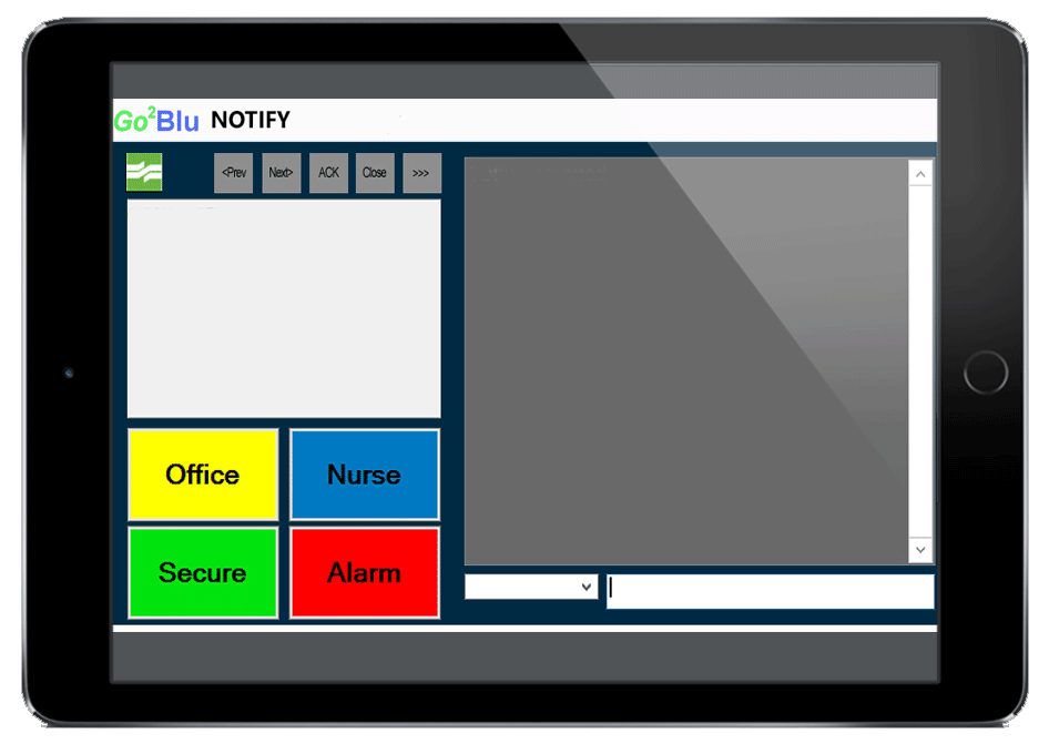 Notify is designed to look and feel the same as Go²Blu 4-button wireless transmitters. Summoning help is simple and immediate. Notify is then used to provide 2-way communications between school administration, emergency responders and school staff.